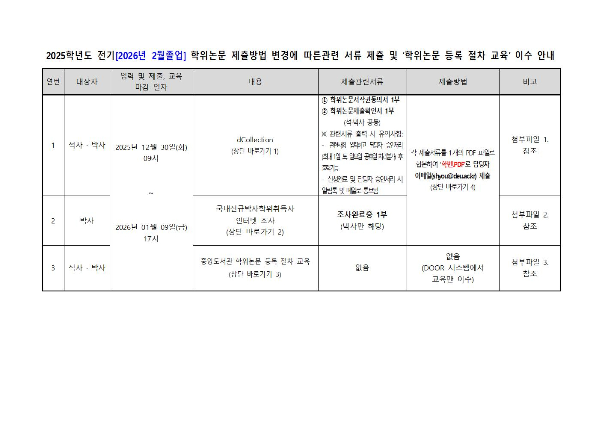[공지] 2025학년도 전기(2026년 2월 졸업) 학위논문 제출방법 변경에 따른 관련 서류 제출 및 학위논문 등록 절차 교육이수 안내